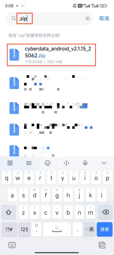 3、下载完成后,找到手机自带的“文件管理”,搜索“.zip”找到刚刚下载的安装包
