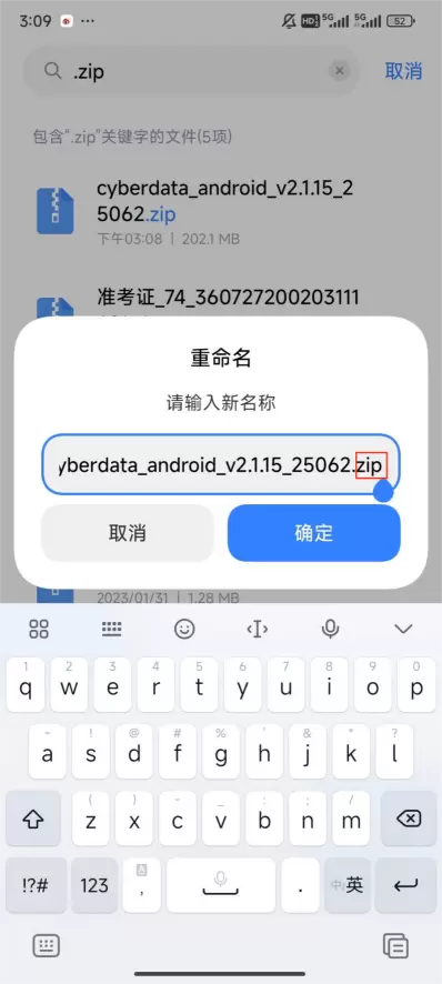 4、长按下载好的赛博云安装包,点击右下角“更多”-“重命名” → 把“zip”删掉改为“apk”后点击确定
