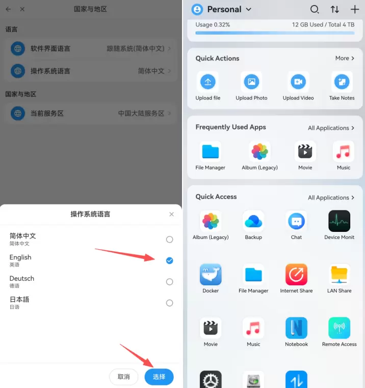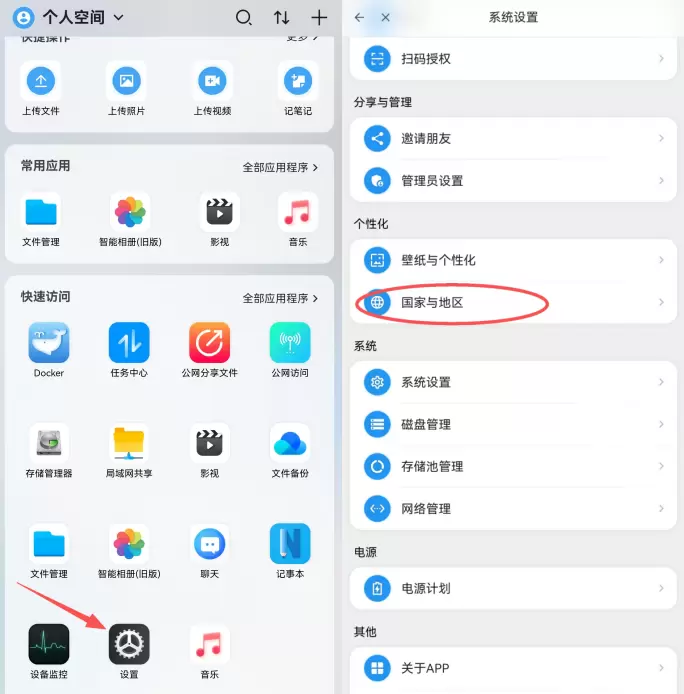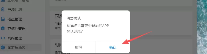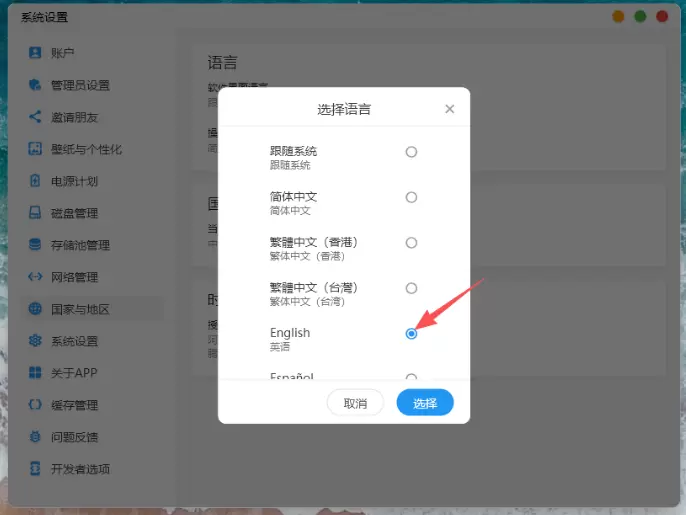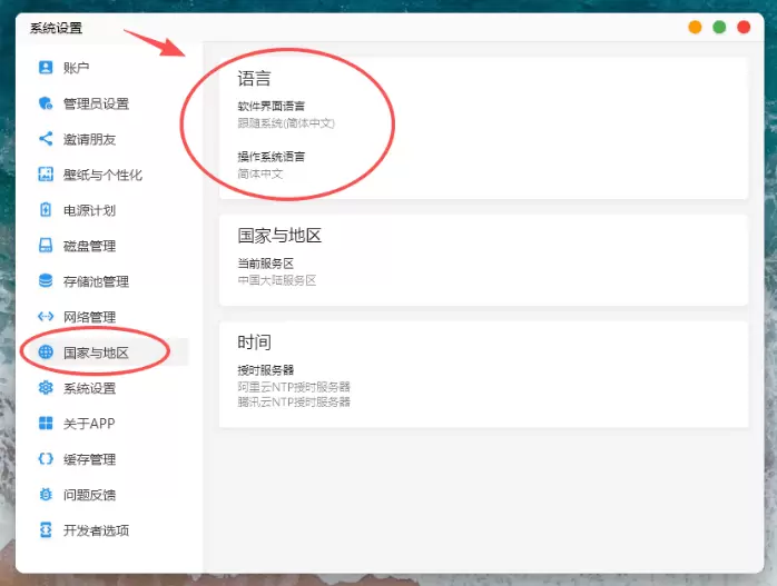 1.登录软件连接好NAS,找到国家与地区中的“语言”
