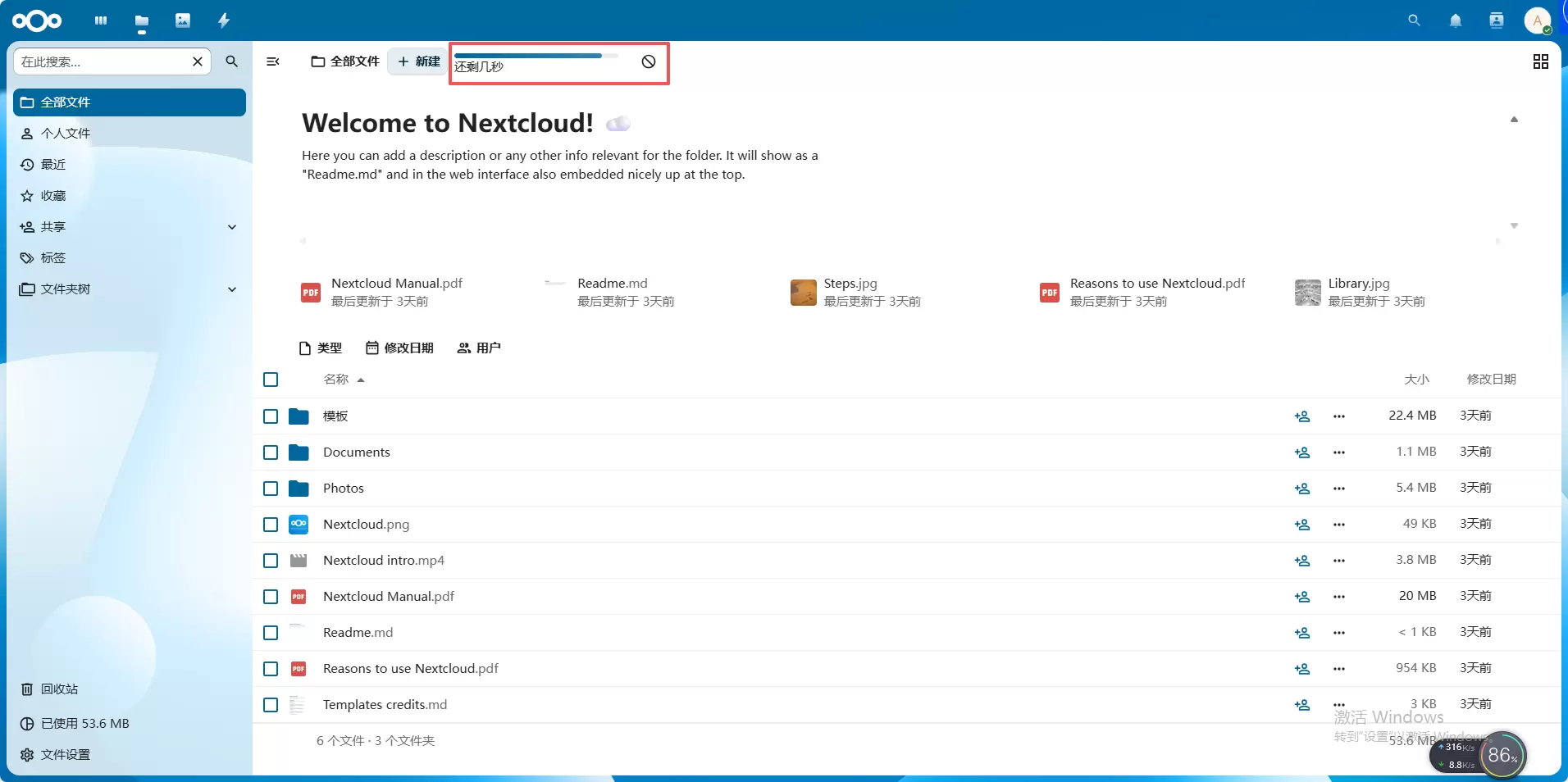 点击上传文件,选择好文件后页面会显示还剩几秒上传成功,上传完成后可以在列表看到上传的文件