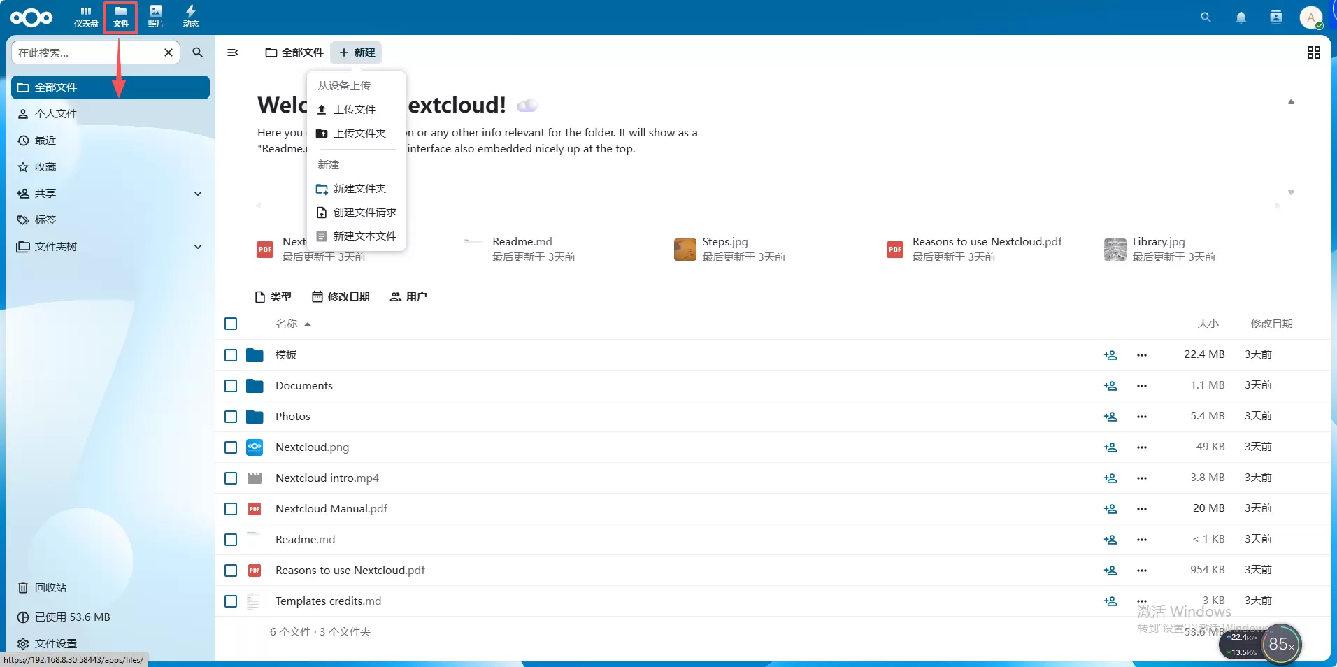 6、鼠标移到左上角可以看到文件模块,这里可以查看到所有的文件,也可以对文件进行上传、新建等功能。