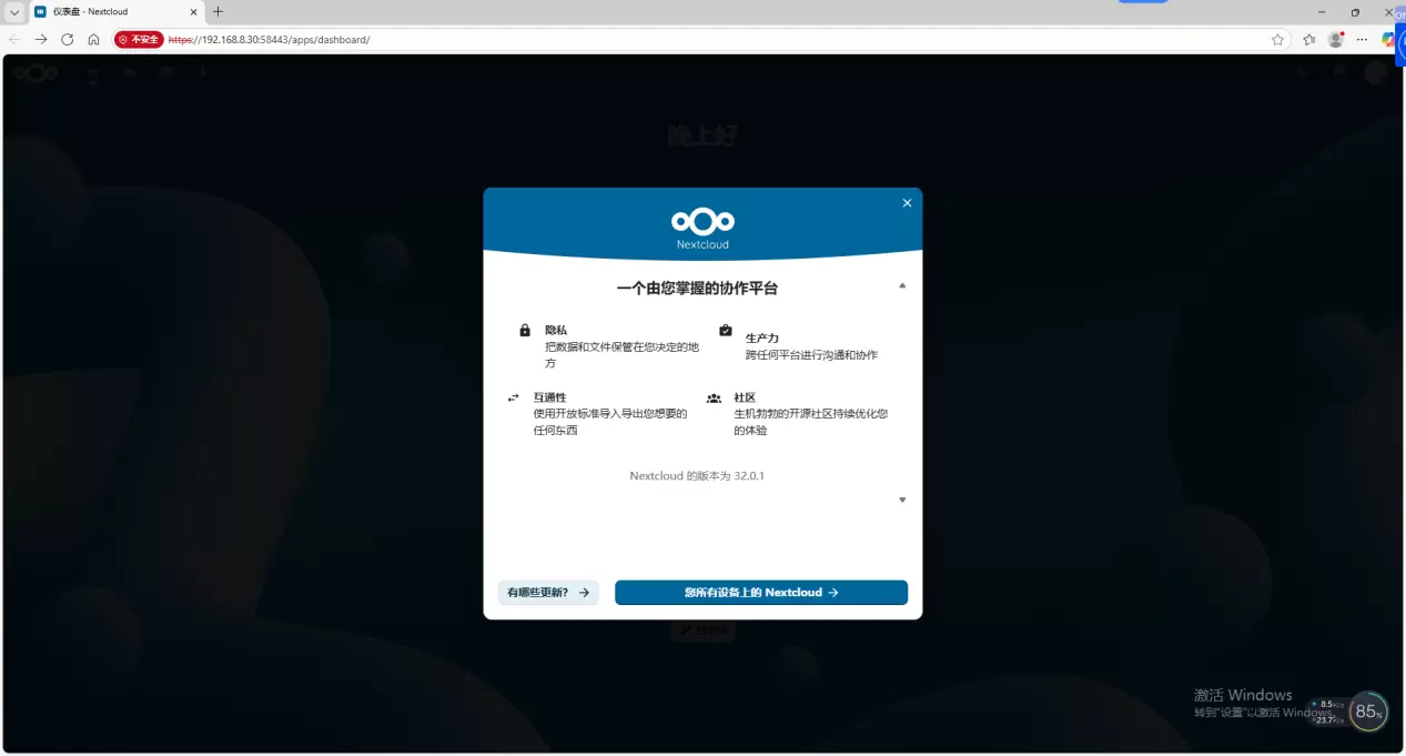 4、安装成功后会弹出该弹窗,点击【 × 】关闭后就显示仪表盘首页