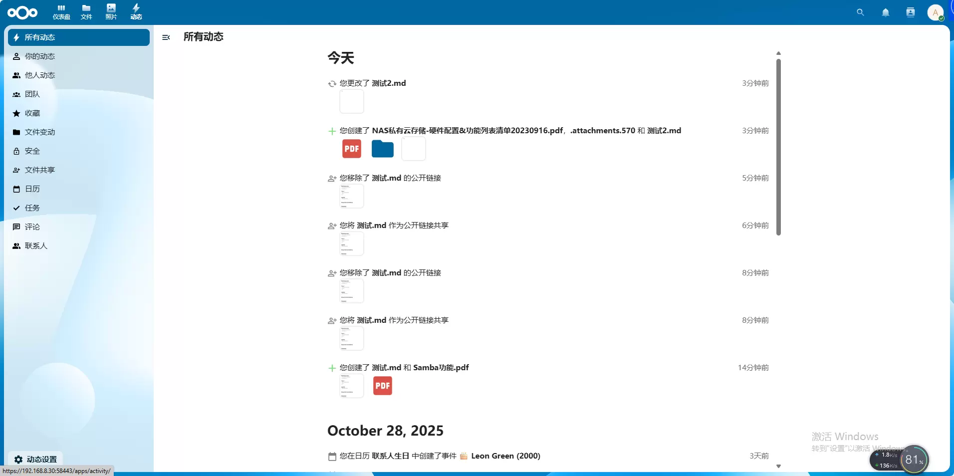 8、鼠标移到左上方点击动态模块即可看到所有冬天信息,比如刚刚新创建的文件等